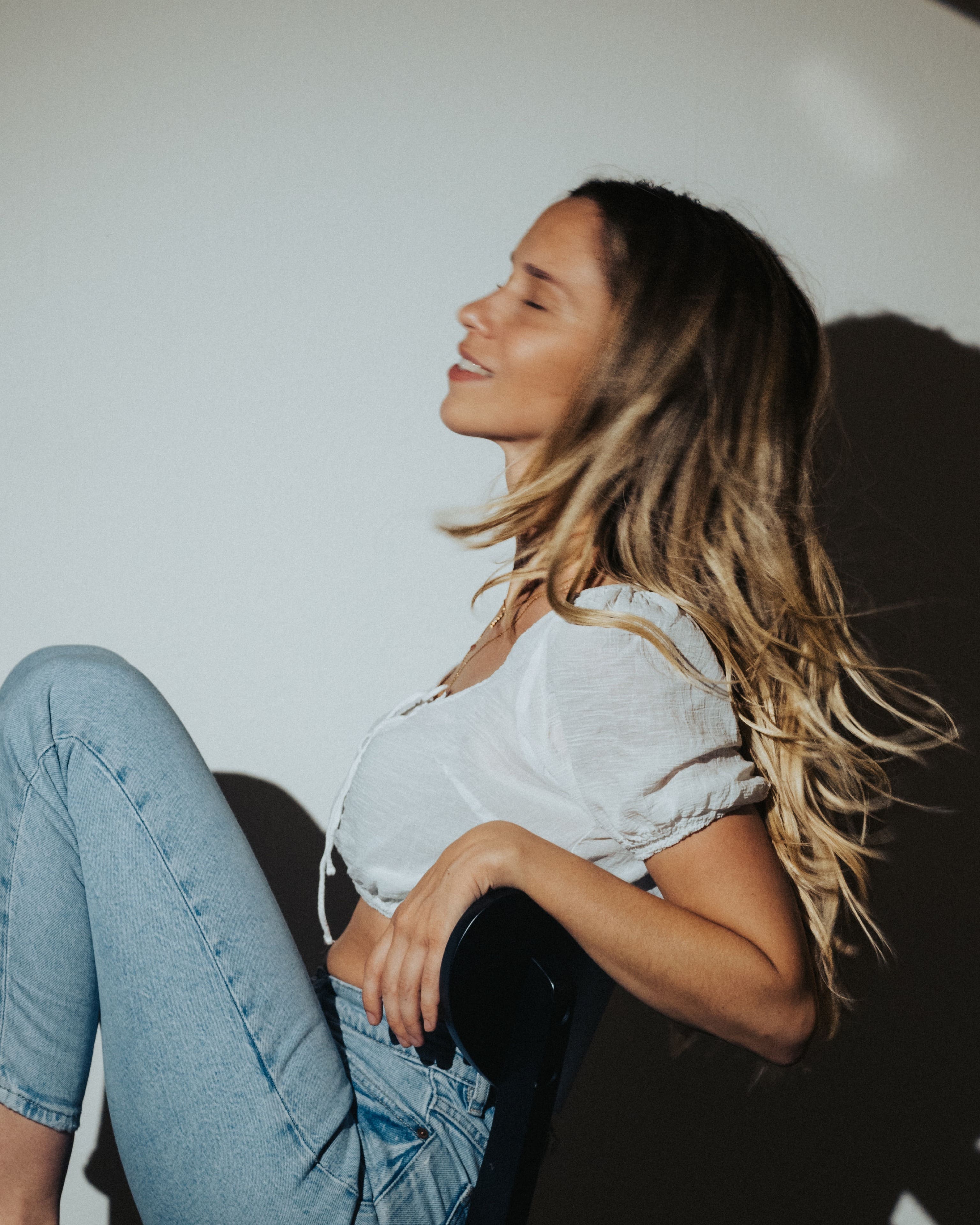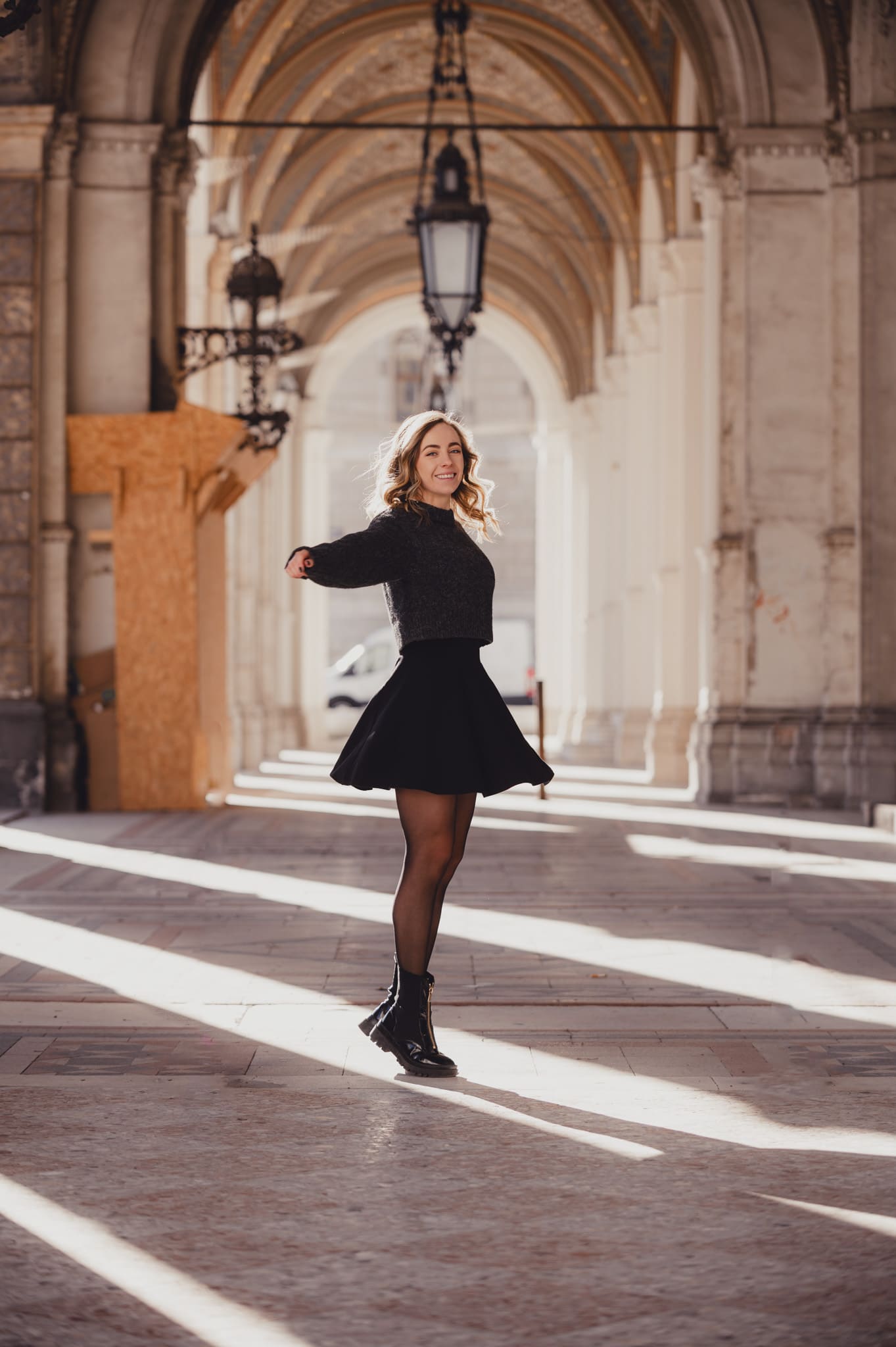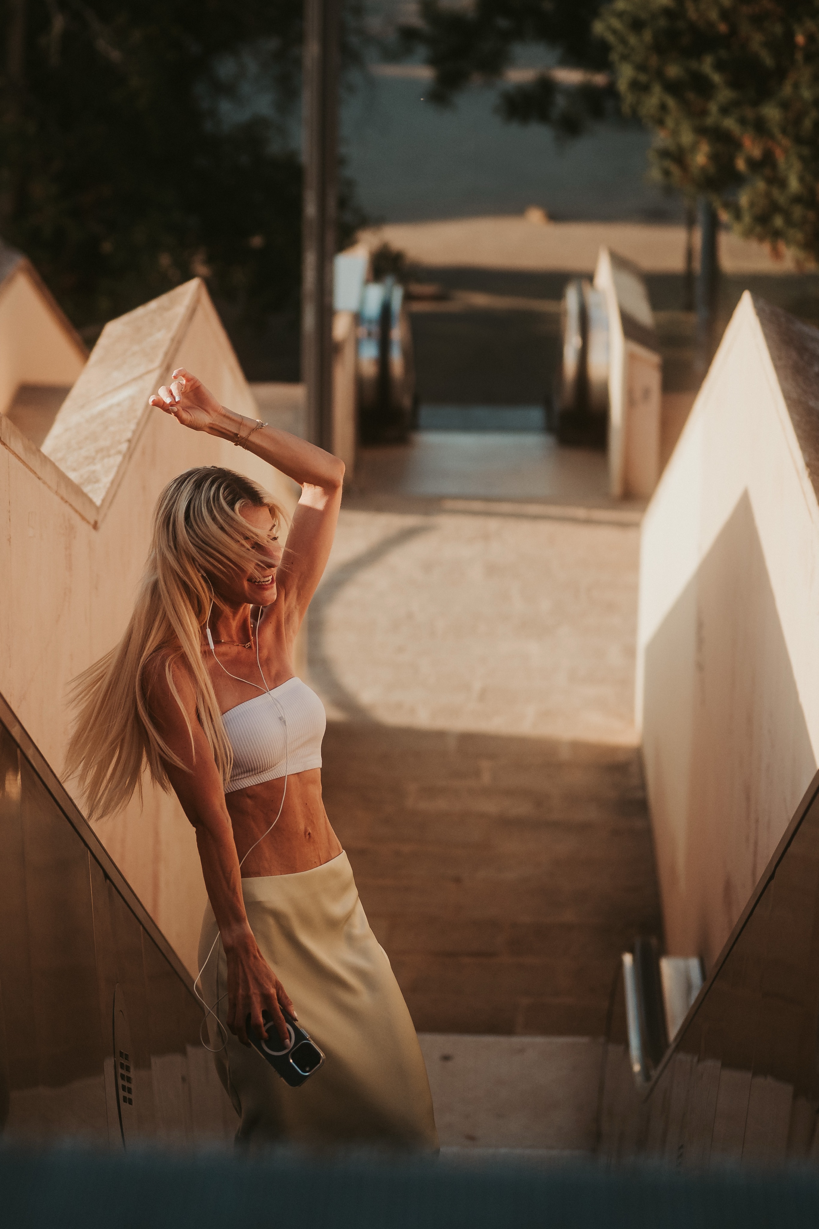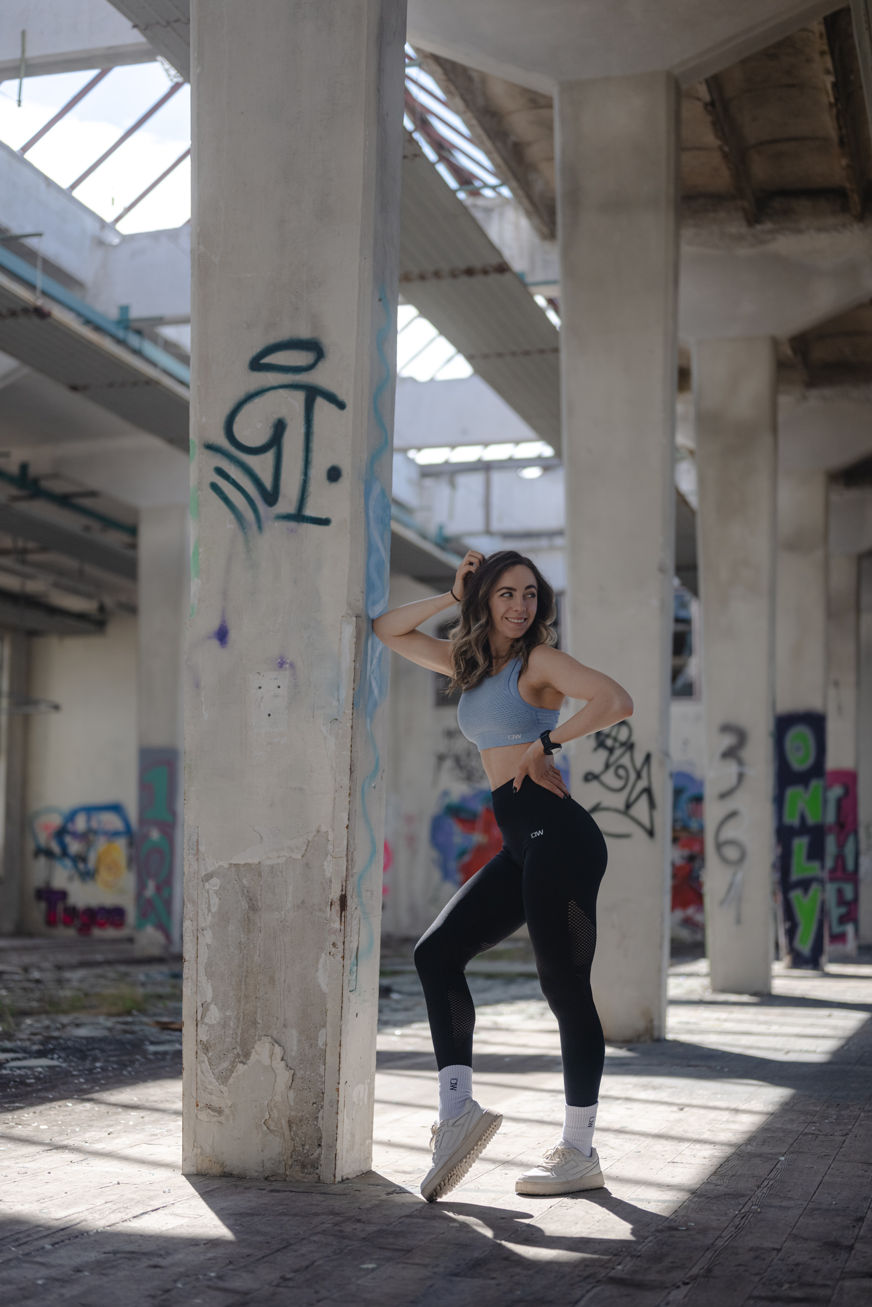Frau liegt entspannt auf weißer Bettdecke, Augen geschlossen, trägt schwarzes Top und lange schwarze Handschuhe, dunkles gewelltes Haar ausgebreitet. Frau in schimmerndem, halbtransparentem Abendkleid und schwarzen High Heels bückt sich auf einem gepflasterten Gehweg bei Nacht, Blick zur Seite, umgeben von warmem Straßenlaternenlicht. Nahaufnahme einer lächelnden Frau mit langen blonden Haaren und weißem Top, die im warmen Gegenlicht draußen sich die Haare zurückstreicht. Frau in schwarzer Lingerie mit langen schwarzen Handschuhen und funkelnder Halskette liegt auf weißer Bettwäsche, dunkles lockiges Haar ausgebreitet, blickt seitlich. Frau mit langen blonden Haaren sitzt lachend auf einem hellen Außensofa, hält ein Tablet und einen Stift, trägt hellblaues Hemd und Jeansshorts; im Hintergrund ein unscharfes mehrstöckiges Gebäude. Frau in schwarzem, rückenfreiem Kleid und schwarzen High Heels lehnt elegant über das Balkongeländer, unscharfe Wohnhäuser und Dämmerungslichter im Hintergrund. Sportliche junge Frau im schwarzen Sporttop, die sich lächelnd die Haare zu einem Dutt bindet, vor einer verfallenen, mit Graffiti bedeckten Industriehalle. Eine Frau in einem langen, transparent schimmernden Abendkleid und hohen Pumps steht nachts auf einem gepflasterten Weg vor modernen Gebäuden, das Haar vom Wind bewegt, sie blickt seitlich. Lächelnde blonde Frau mit Sonnenbrille auf dem Kopf, hellem Strickpullover und schwarzem Schulterriemen, unscharfer Promenadenhintergrund mit Palmen. Frau sitzt barfuß seitlich auf einem schwarzen Stuhl, Kopf nach hinten geneigt und Augen geschlossen, trägt weiße Bluse und helle Jeans, beleuchtet von einem kreisrunden Scheinwerfer mit Schatten an der Wand. Seitliches Porträt einer lächelnden Frau mit geschlossenen Augen, die in einem Stuhl zurückgelehnt ist; langes blondes Haar weht, sie trägt eine weiße Bluse und helle Jeans vor einer hellen Wand mit Schatten. Frau sitzt lächelnd auf einer Holzbank in einer Stadtpassage, blickt zur Seite und berührt ihr Haar; sie trägt einen schwarzen Pullover, roten Rock mit weißem Blumenmuster, schwarze Strumpfhose und schwarze Stiefel, warmes Seitenlicht beleuchtet die Szene. Frau mit langen blonden Haaren und neutralem Blick sitzt locker auf einem hellgrauen Sofa, trägt schwarzes Spaghettiträger-Top und schwarze Hose, Hände locker vor dem Körper, Stehlampe im Hintergrund. Junge Frau mit langen blonden Haaren in schwarzem Spaghettiträger-Top und hoher schwarzer Hose vor einer hellen Wand, Hände in der Hüfte, seitlich blickend, mit goldenen Ketten und Ohrringen. Frau im Profil vor großem rundem Licht, trägt schwarzes Spaghettiträger-Top, lange helle Haare und goldene Ketten, ruhiger Gesichtsausdruck. Junge blonde Frau sitzt auf dem Sofa, hält ein Smartphone und hat einen Stift im Mund, schaut nachdenklich; unscharfer Küchenhintergrund mit einer stehenden Person. Seitliches Porträt einer jungen Frau in schwarzer Kleidung, barfuß auf einem Stuhl sitzend mit angewinkelten Beinen vor einem großen, runden, orangefarbenen Lichtkreis an der Wand. Junge Frau sitzt barfuß auf sandigem Boden, umarmt die angewinkelten Beine, trägt ein weißes gehäkeltes Oberteil und ein Fußkettchen, lange braune Haare, Blick zur Kamera, warme Abendstimmung vor grünen Büschen. Porträt einer jungen Frau mit dunkelblondem Haar in schwarzem Spaghettiträgertop, goldenen Ketten und Ohrringen, sitzend vor einer hellen, strahlenförmigen Lichtprojektion an der Wand, ernster Blick. Nachdenkliche Frau in Seitenansicht, sitzt auf einem Stuhl, trägt schwarzes Spaghettiträger-Top und zwei goldene Ketten, eine Hand an der Stirn, lange blonde Haare, vor einer Wand mit strahlenförmigem Lichtmuster. Seitliches Porträt einer jungen Frau in schwarzem Top, zurückgelehnt auf einem Stuhl, Augen geschlossen, langes Haar im warmen, runden Gegenlicht. Junge Frau mit schulterlangen lockigen Haaren hockt lächelnd auf einer Betonmauer vor einer gelb-orangeen Graffiti-Wand, trägt weißen Pullover, blaue Jeans und weiße Sneaker. Person in Sportkleidung sitzt nach vorn gebeugt auf einem Ergometer in einem Untersuchungsraum, trägt Atemmaske mit Messschlauch und Kopfhalterung; daneben zwei Monitore mit Messdaten, Arbeitswagen und Ventilator. Frau mit langen blonden Haaren sitzt barfuß zusammengekauert auf einem Stuhl, stützt den Kopf mit der Hand und blickt nach rechts, warm beleuchtetes Wohnzimmer mit Sofa im Hintergrund. Frau mit langen blonden Haaren in schwarzem, rückenfreiem Top steht vor einem runden Wandspiegel und blickt über die Schulter auf ihre Spiegelung. Frau mit langen blonden Haaren in schwarzem Spaghettiträger-Top und Jeans-Shorts steht im warmen Abendlicht, lächelt und streicht sich mit einer Hand durchs Haar, unscharfer historischer Steinbau im Hintergrund. Frau mit langen blonden Haaren in schwarzem Croptop und zerrissenen Jeansshorts steht auf sonniger Fußgängerstraße, schaut leicht zur Seite und streicht sich durchs Haar; unscharfer urbaner Hintergrund mit Passanten. Lächelnde Frau mit langen blonden Haaren und großer Sonnenbrille, trägt weißes Bandeau-Top und steht lässig an einer Steinmauer im warmen Gegenlicht. Junge Frau hockt lächelnd vor einer bunten Graffitiwand, trägt weißen Pullover, hochgekrempelte Jeans und weiße Sneaker. Junge Frau mit schulterlangen, gewellten braunen Haaren in weißem Pullover und Jeans, die lächelnd ihr Kinn auf die Hand stützt, vor unscharfem, buntem Graffiti-Hintergrund. Junge Frau lacht, trägt schwarzen Steppmantel und gestepp­ten Anglerhut, helle Haarsträhnen, weißer Pullover und quer getragene schwarze Bauchtasche vor einer dunkel ornamentierten Metalltür. Lächelnde Frau vor verwitterter Steinmauer, Hände in der Taille, weißer Pullover, blaue Jeans und weiße Sneaker auf gepflastertem Boden. Frau in schwarzem Rock, Pullover, Strumpfhose und Stiefel dreht sich lächelnd in einer historischen Arkade mit gewölbten Bögen und hängenden Lat