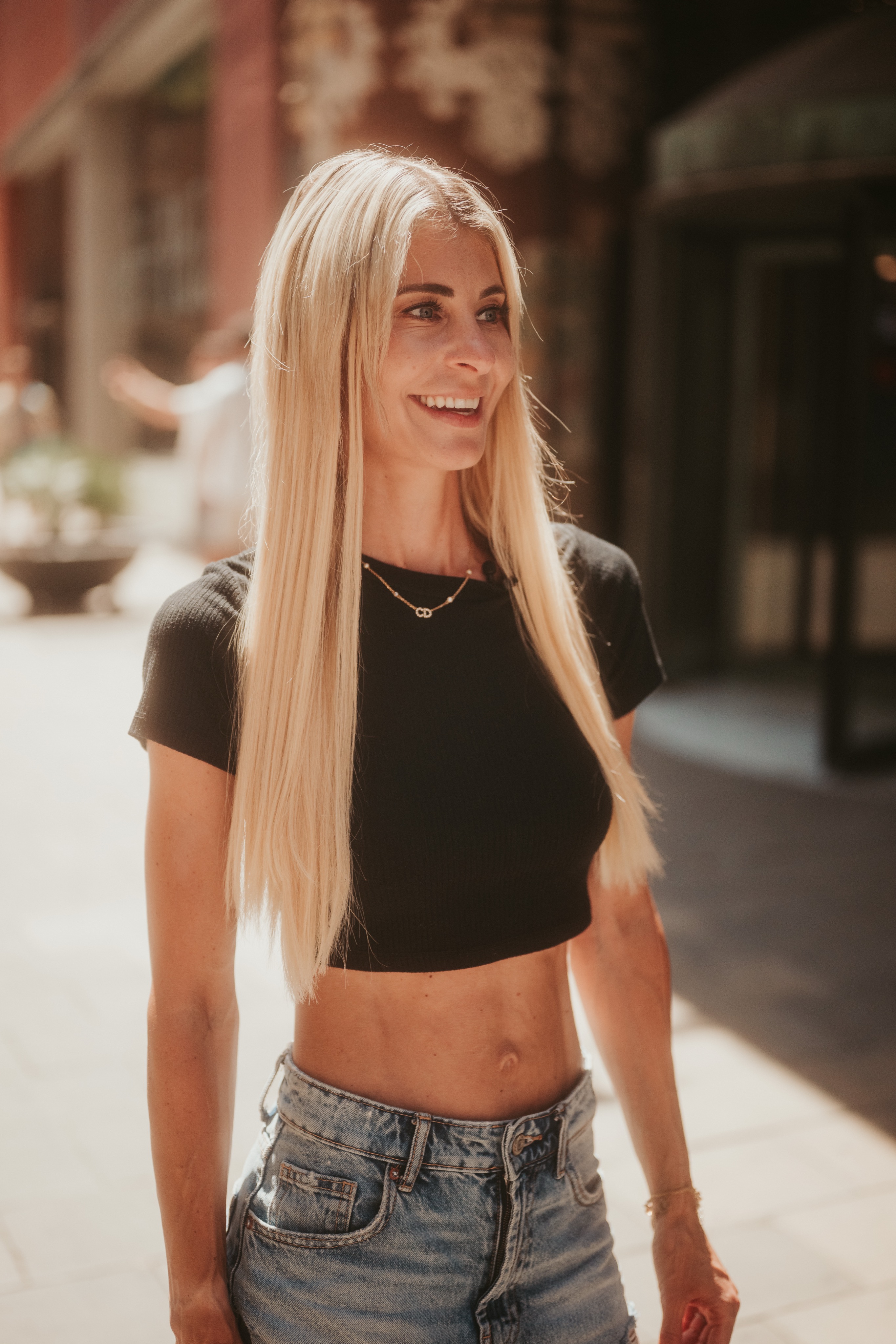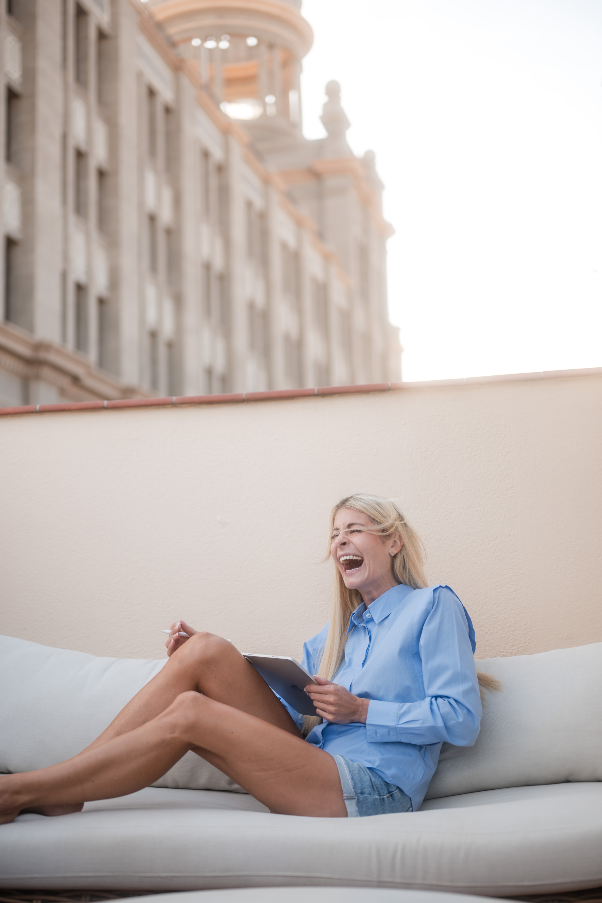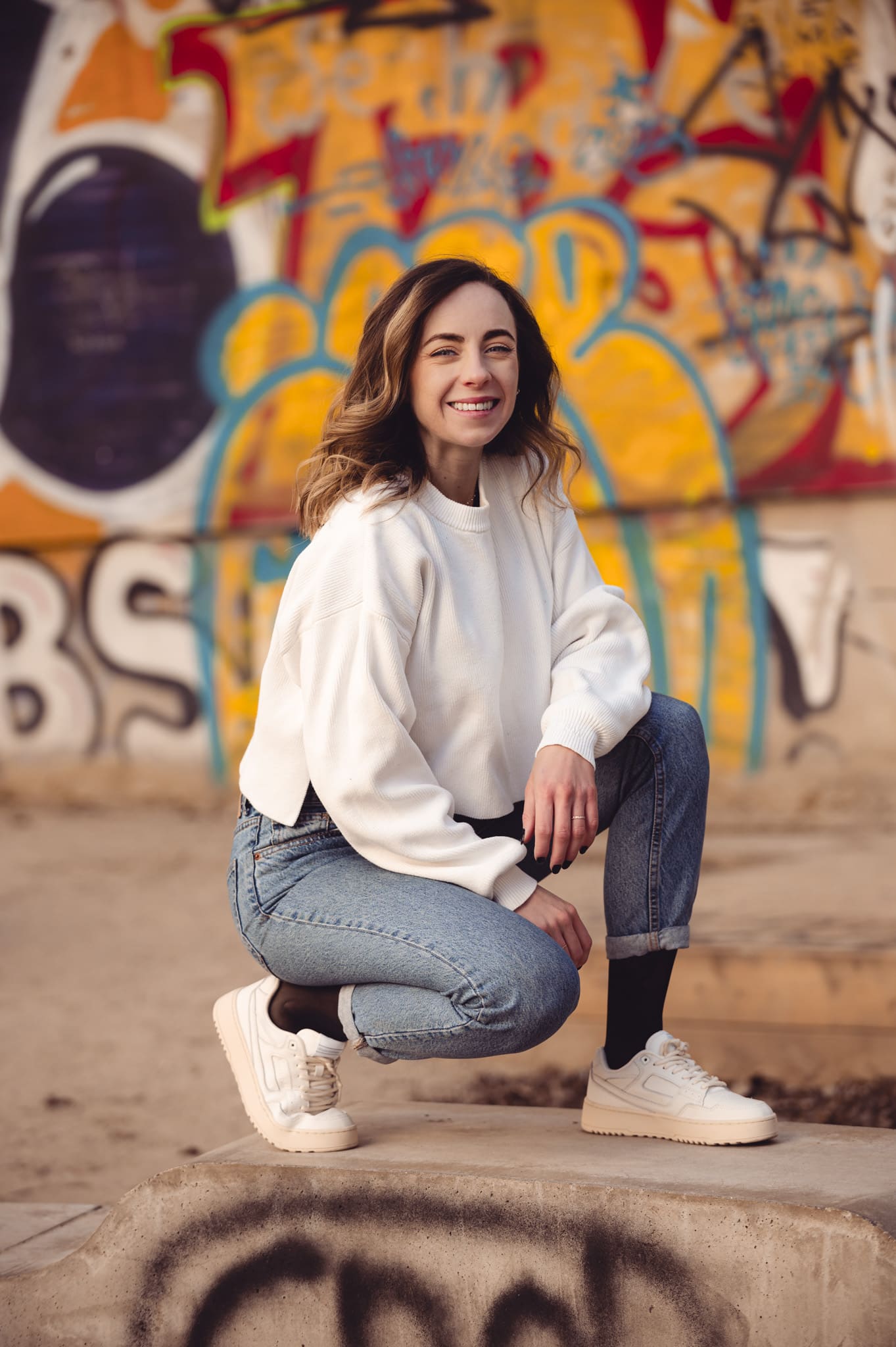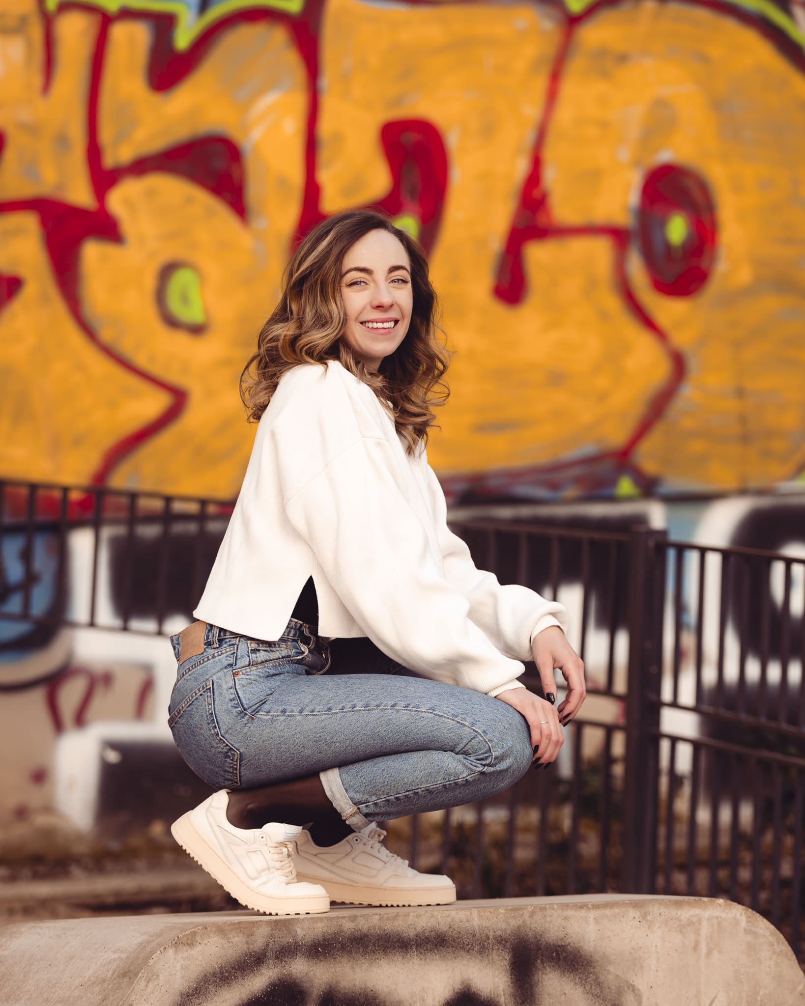 Frau liegt entspannt auf weißer Bettdecke, Augen geschlossen, trägt schwarzes Top und lange schwarze Handschuhe, dunkles gewelltes Haar ausgebreitet. Frau in schimmerndem, halbtransparentem Abendkleid und schwarzen High Heels bückt sich auf einem gepflasterten Gehweg bei Nacht, Blick zur Seite, umgeben von warmem Straßenlaternenlicht. Nahaufnahme einer lächelnden Frau mit langen blonden Haaren und weißem Top, die im warmen Gegenlicht draußen sich die Haare zurückstreicht. Frau in schwarzer Lingerie mit langen schwarzen Handschuhen und funkelnder Halskette liegt auf weißer Bettwäsche, dunkles lockiges Haar ausgebreitet, blickt seitlich. Frau mit langen blonden Haaren sitzt lachend auf einem hellen Außensofa, hält ein Tablet und einen Stift, trägt hellblaues Hemd und Jeansshorts; im Hintergrund ein unscharfes mehrstöckiges Gebäude. Frau in schwarzem, rückenfreiem Kleid und schwarzen High Heels lehnt elegant über das Balkongeländer, unscharfe Wohnhäuser und Dämmerungslichter im Hintergrund. Sportliche junge Frau im schwarzen Sporttop, die sich lächelnd die Haare zu einem Dutt bindet, vor einer verfallenen, mit Graffiti bedeckten Industriehalle. Eine Frau in einem langen, transparent schimmernden Abendkleid und hohen Pumps steht nachts auf einem gepflasterten Weg vor modernen Gebäuden, das Haar vom Wind bewegt, sie blickt seitlich. Lächelnde blonde Frau mit Sonnenbrille auf dem Kopf, hellem Strickpullover und schwarzem Schulterriemen, unscharfer Promenadenhintergrund mit Palmen. Frau sitzt barfuß seitlich auf einem schwarzen Stuhl, Kopf nach hinten geneigt und Augen geschlossen, trägt weiße Bluse und helle Jeans, beleuchtet von einem kreisrunden Scheinwerfer mit Schatten an der Wand. Seitliches Porträt einer lächelnden Frau mit geschlossenen Augen, die in einem Stuhl zurückgelehnt ist; langes blondes Haar weht, sie trägt eine weiße Bluse und helle Jeans vor einer hellen Wand mit Schatten. Frau sitzt lächelnd auf einer Holzbank in einer Stadtpassage, blickt zur Seite und berührt ihr Haar; sie trägt einen schwarzen Pullover, roten Rock mit weißem Blumenmuster, schwarze Strumpfhose und schwarze Stiefel, warmes Seitenlicht beleuchtet die Szene. Frau mit langen blonden Haaren und neutralem Blick sitzt locker auf einem hellgrauen Sofa, trägt schwarzes Spaghettiträger-Top und schwarze Hose, Hände locker vor dem Körper, Stehlampe im Hintergrund. Junge Frau mit langen blonden Haaren in schwarzem Spaghettiträger-Top und hoher schwarzer Hose vor einer hellen Wand, Hände in der Hüfte, seitlich blickend, mit goldenen Ketten und Ohrringen. Frau im Profil vor großem rundem Licht, trägt schwarzes Spaghettiträger-Top, lange helle Haare und goldene Ketten, ruhiger Gesichtsausdruck. Junge blonde Frau sitzt auf dem Sofa, hält ein Smartphone und hat einen Stift im Mund, schaut nachdenklich; unscharfer Küchenhintergrund mit einer stehenden Person. Seitliches Porträt einer jungen Frau in schwarzer Kleidung, barfuß auf einem Stuhl sitzend mit angewinkelten Beinen vor einem großen, runden, orangefarbenen Lichtkreis an der Wand. Junge Frau sitzt barfuß auf sandigem Boden, umarmt die angewinkelten Beine, trägt ein weißes gehäkeltes Oberteil und ein Fußkettchen, lange braune Haare, Blick zur Kamera, warme Abendstimmung vor grünen Büschen. Porträt einer jungen Frau mit dunkelblondem Haar in schwarzem Spaghettiträgertop, goldenen Ketten und Ohrringen, sitzend vor einer hellen, strahlenförmigen Lichtprojektion an der Wand, ernster Blick. Nachdenkliche Frau in Seitenansicht, sitzt auf einem Stuhl, trägt schwarzes Spaghettiträger-Top und zwei goldene Ketten, eine Hand an der Stirn, lange blonde Haare, vor einer Wand mit strahlenförmigem Lichtmuster. Seitliches Porträt einer jungen Frau in schwarzem Top, zurückgelehnt auf einem Stuhl, Augen geschlossen, langes Haar im warmen, runden Gegenlicht. Junge Frau mit schulterlangen lockigen Haaren hockt lächelnd auf einer Betonmauer vor einer gelb-orangeen Graffiti-Wand, trägt weißen Pullover, blaue Jeans und weiße Sneaker. Person in Sportkleidung sitzt nach vorn gebeugt auf einem Ergometer in einem Untersuchungsraum, trägt Atemmaske mit Messschlauch und Kopfhalterung; daneben zwei Monitore mit Messdaten, Arbeitswagen und Ventilator. Frau mit langen blonden Haaren sitzt barfuß zusammengekauert auf einem Stuhl, stützt den Kopf mit der Hand und blickt nach rechts, warm beleuchtetes Wohnzimmer mit Sofa im Hintergrund. Frau mit langen blonden Haaren in schwarzem, rückenfreiem Top steht vor einem runden Wandspiegel und blickt über die Schulter auf ihre Spiegelung. Frau mit langen blonden Haaren in schwarzem Spaghettiträger-Top und Jeans-Shorts steht im warmen Abendlicht, lächelt und streicht sich mit einer Hand durchs Haar, unscharfer historischer Steinbau im Hintergrund. Frau mit langen blonden Haaren in schwarzem Croptop und zerrissenen Jeansshorts steht auf sonniger Fußgängerstraße, schaut leicht zur Seite und streicht sich durchs Haar; unscharfer urbaner Hintergrund mit Passanten. Lächelnde Frau mit langen blonden Haaren und großer Sonnenbrille, trägt weißes Bandeau-Top und steht lässig an einer Steinmauer im warmen Gegenlicht. Junge Frau hockt lächelnd vor einer bunten Graffitiwand, trägt weißen Pullover, hochgekrempelte Jeans und weiße Sneaker. Junge Frau mit schulterlangen, gewellten braunen Haaren in weißem Pullover und Jeans, die lächelnd ihr Kinn auf die Hand stützt, vor unscharfem, buntem Graffiti-Hintergrund. Junge Frau lacht, trägt schwarzen Steppmantel und gestepp­ten Anglerhut, helle Haarsträhnen, weißer Pullover und quer getragene schwarze Bauchtasche vor einer dunkel ornamentierten Metalltür. Lächelnde Frau vor verwitterter Steinmauer, Hände in der Taille, weißer Pullover, blaue Jeans und weiße Sneaker auf gepflastertem Boden. Frau in schwarzem Rock, Pullover, Strumpfhose und Stiefel dreht sich lächelnd in einer historischen Arkade mit gewölbten Bögen und hängenden Lat