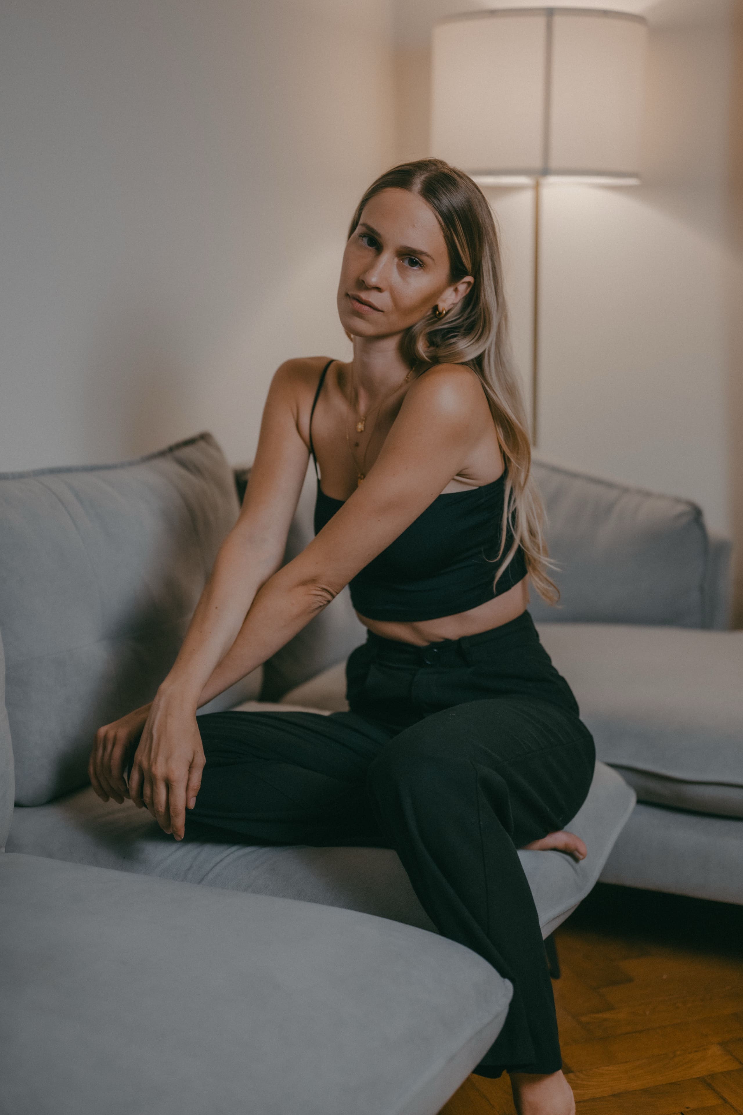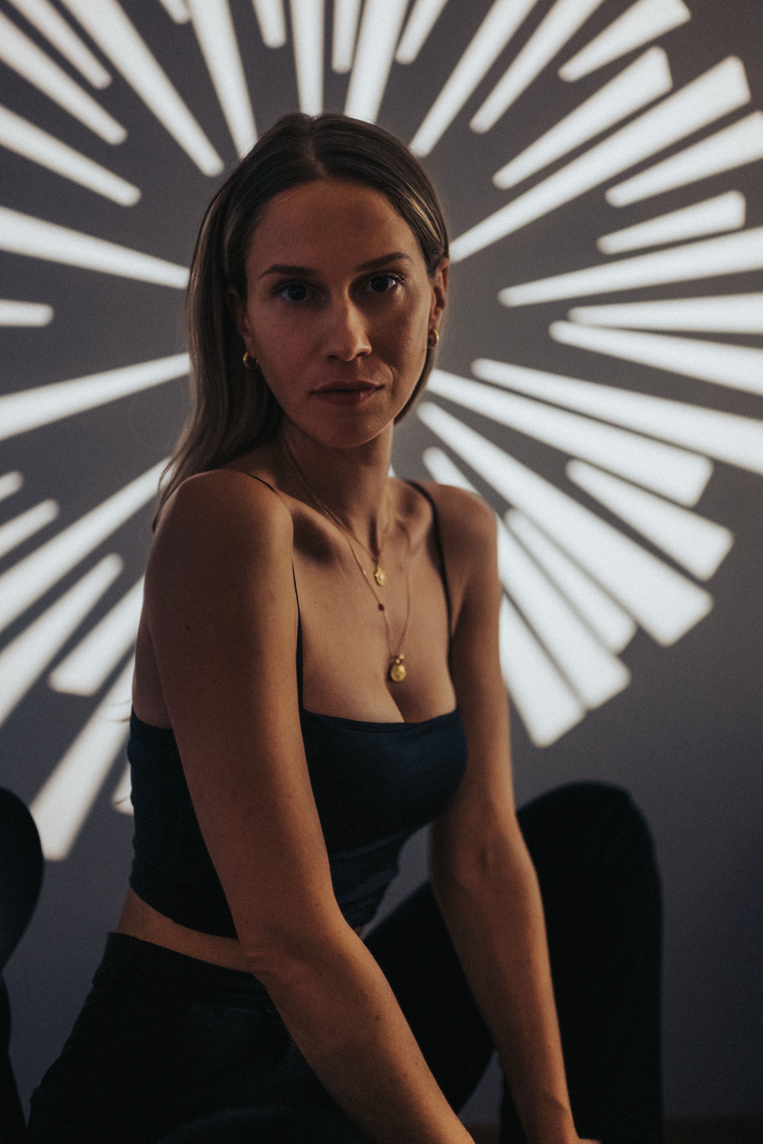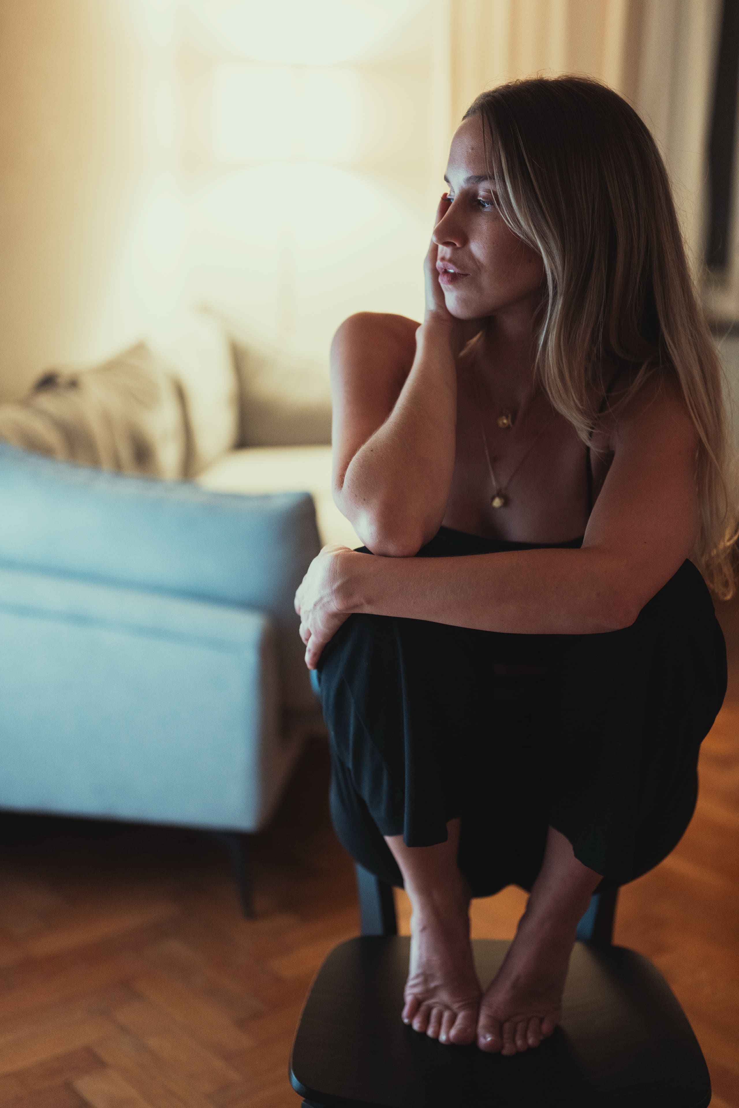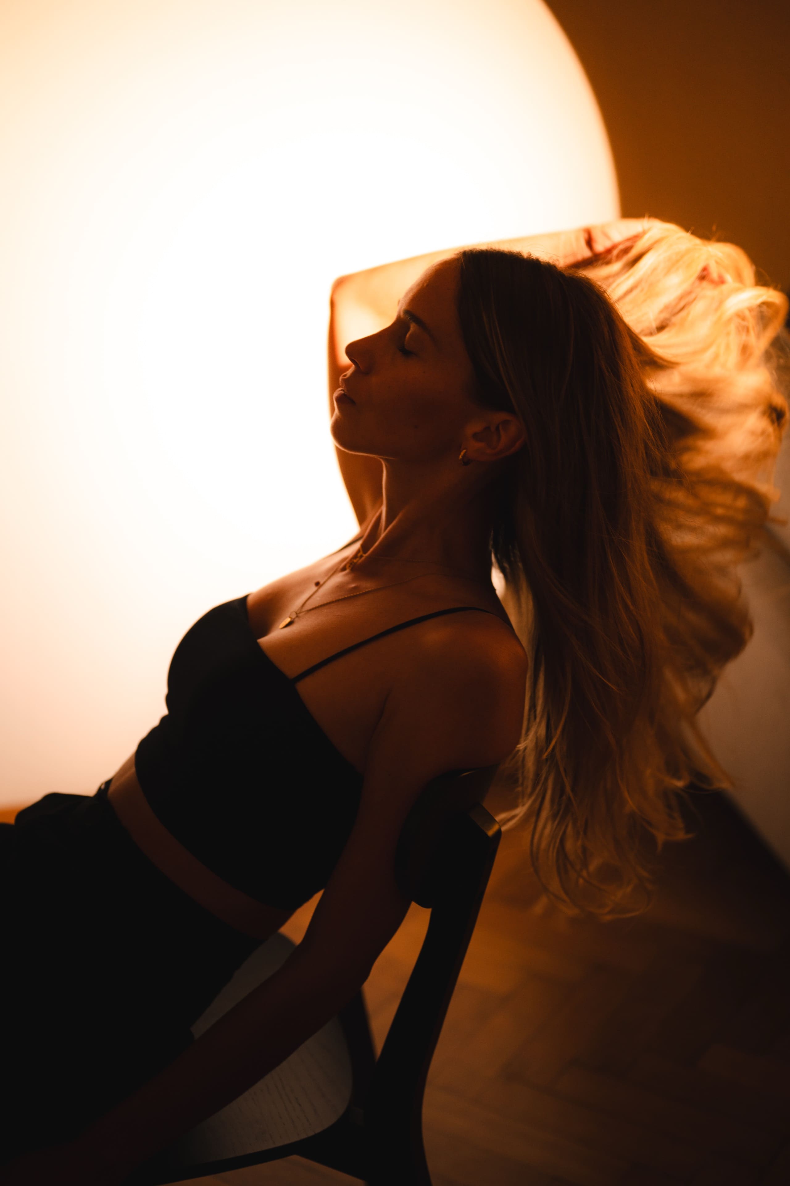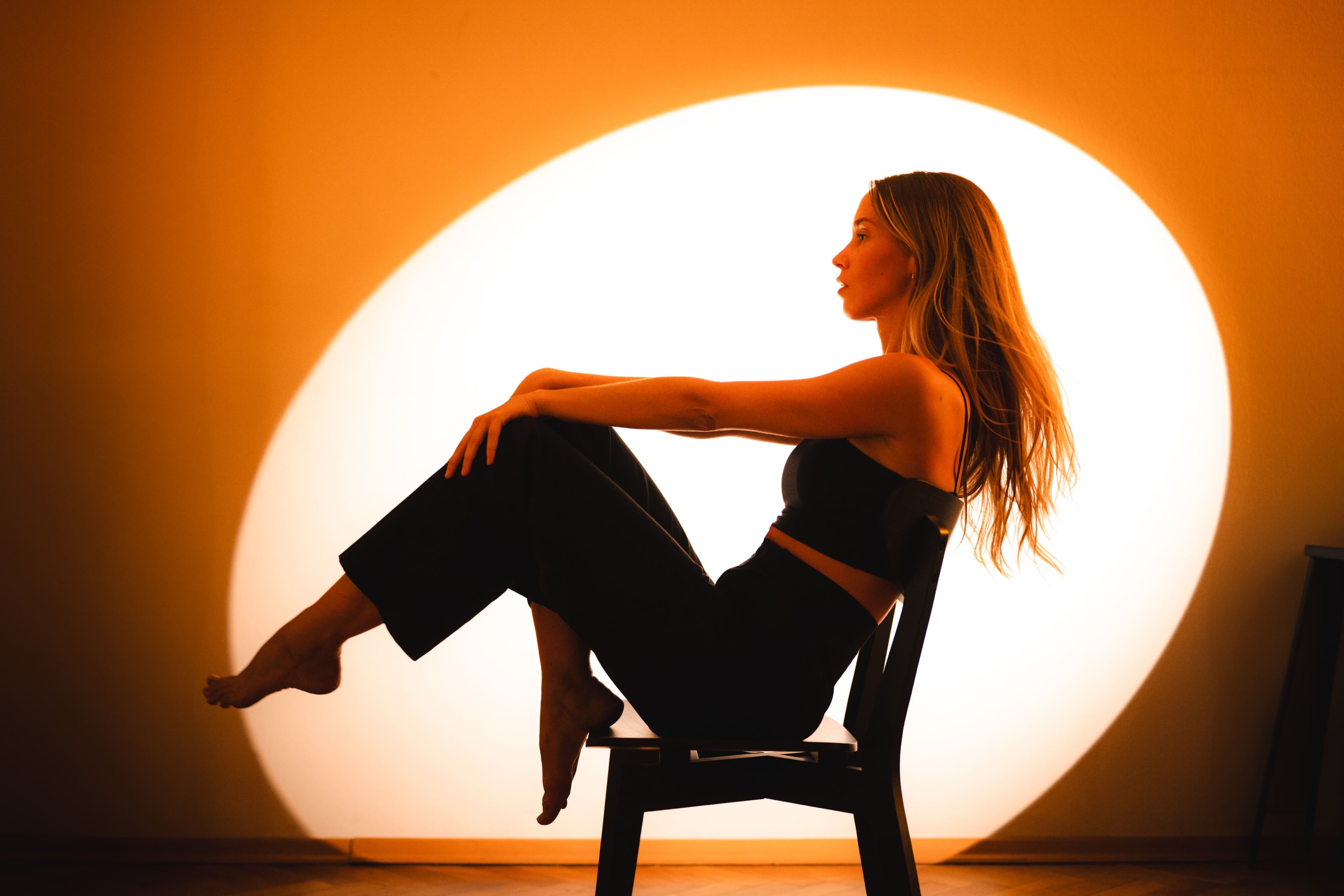 Frau mit langen blonden Haaren in schwarzem Top und Rock hockt barfuß auf einem Stuhl vor großem warmen Kreislicht, nach hinten blickend.