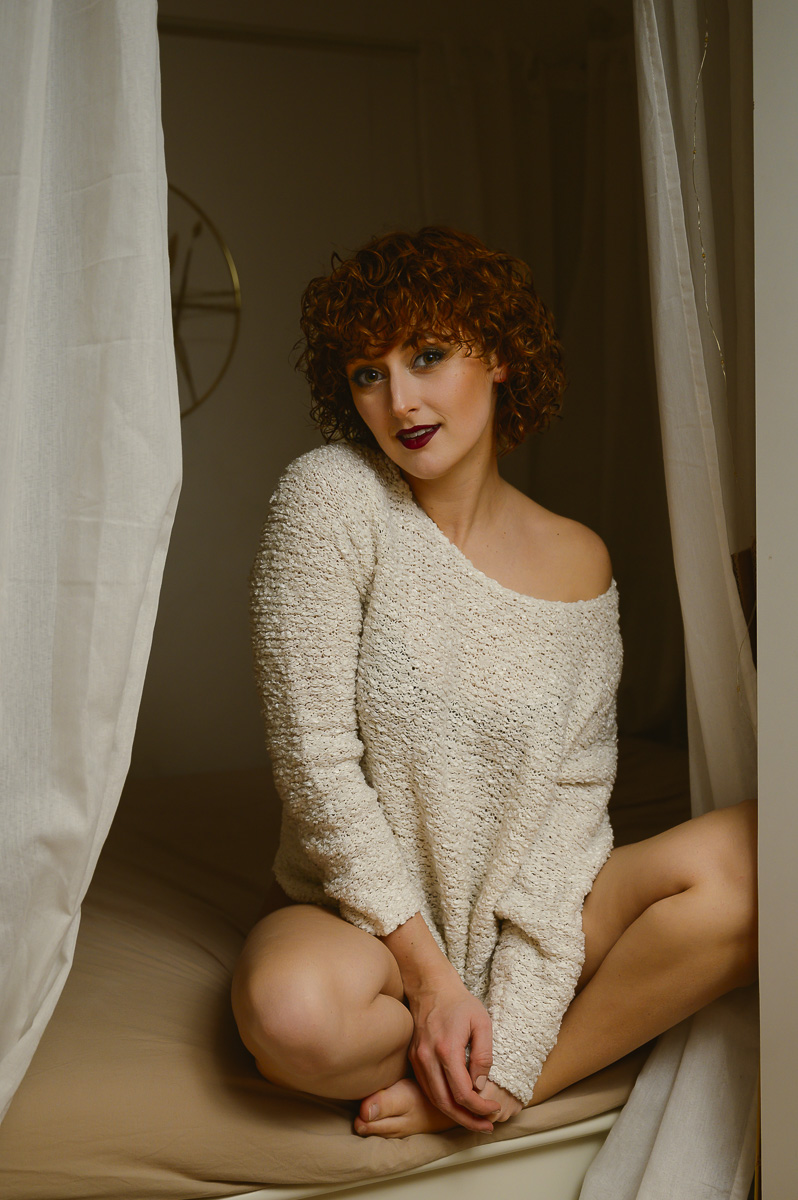 Frau mit kurzen, lockigen Haaren schaut in einen Spiegel und trägt mit einem kleinen Pinsel Augen-Make-up auf; im Vordergrund stehen Seifenpumpflaschen und Make-up-Dosen, warmes, gedämpftes Licht. Frau in schwarzer Unterwäsche liegt bäuchlings auf weißem Bett, lächelnd und mit einer Hand im Haar. Schwarzweiß-Foto, Nahaufnahme einer liegenden Person im Bett, Fokus auf Hüfte und Gesäß in schwarzer Spitzenunterwäsche mit Korsett und Strumpfhaltern. Frau dehnt die Arme über dem Kopf in einem Wohnzimmer, trägt ein rosafarbenes Cropped-Sweatshirt und schwarze Spitzenunterhose, Blick nach unten, unscharfer Regalhintergrund. Porträt einer Frau mit kurzen, lockigen roten Haaren und dunklem Lippenstift, die auf einem Bett zwischen weißen Vorhängen sitzt, einen schulterfreien, grob gestrickten cremefarbenen Pullover trägt, mit angewinkelten Knien und gefalteten Händen und leicht lächelnd in die Kamera blickt. Rückansicht einer Person in schwarzer Spitzenunterhose, barfuß auf Parkettboden, mit einem linearen Tattoo mehrerer stilisierter Katzen am Oberschenkel, gehend durch einen Wohnflur. Frau liegt auf dem Rücken auf einer weichen Decke auf dem Holzboden, trägt ein rosa Oberteil und schwarze Unterwäsche und blickt direkt in die Kamera. Frau in schwarzer Spitzenunterwäsche liegt auf dem Rücken auf hellem Holzfußboden im Sonnenlicht vor einem großen Fenster, Beine angewinkelt und Blick zur Kamera. Bäuchlings liegende Person auf einem Bett, Nahaufnahme des Gesäßes in schwarzer Spitzenunterwäsche, dunkles Oberteil und beiger Plaid im Hintergrund. Profilnahaufnahme einer jungen Frau mit dunklen Haaren und Sommersprossen, braunen Augen und leicht geöffneten Lippen, Sonnenlicht wirft Streifen und Schatten über Wange und Hals, kleines Ohrring sichtbar. Frau mit zurückgeworfenem Kopf und geschlossenen Augen, trägt schwarzen Spitzen-BH mit Zierbändern und einen schwarzen Choker mit Perlenanhänger, lange Haare wehend. 20220911-19-25-42-dsc_4254.jpg Frau mit kurzen, lockigen kastanienroten Haaren und rotem Lippenstift liegt auf dem Bauch auf einem dunklen Sofa, trägt rotes Spitzen‑Dessous und schwarze Strümpfe, schaut direkt in die Kamera; Blumen‑Tattoo am Oberarm sichtbar. Frau liegt entspannt auf einer hellgrauen Decke auf Holzfußboden, trägt rosa Pullover und schwarze Unterwäsche, lächelt mit geschlossenen Augen, Arme und Beine locker zur Seite ausgestreckt. Person mit kurzen, lockigen roten Haaren und rotem Lippenstift in roter Spitzenunterwäsche und schwarzen Strümpfen liegt auf dem Bauch auf einem dunklen Sofa, schaut seitlich; Blumen-Tattoo am Oberarm sichtbar. Porträt einer Frau mit kurzen lockigen Haaren, die augenzwinkernd lächelt und mit einem Finger die Lippen berührt; sie trägt ein schwarzes Federkleid mit funkelnden Fransen, ein auffälliges Armband, Ohrringe und ein sichtbares Tattoo am Oberarm. 20240309-132750.jpg Schwarzweißaufnahme einer liegenden Person, Fokus auf Rücken und Gesäß in schwarzer Spitzenunterwäsche mit Strapsen und Strümpfen auf einem Bett. Schwarzweiß-Foto einer auf dem Rücken liegenden Person in engem Langarm-Body auf Holzfußboden, Hüfte gehoben, Beine angewinkelt und Arme über den Kopf ausgestreckt, mit Sonnenbrille vor einem hell hinterleuchteten Vorhang. Nahaufnahme einer jungen Frau mit dunklen Haaren und Sommersprossen, die direkt in die Kamera blickt und ein bordeauxfarbenes Trägertop trägt, unscharfer Hintergrund.